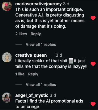 1. Thank you so much for your comment. A lot of persons are saying the extreme AI use in advertising is detracting them from making purchases and I personally have disregarded companies that use AI like this and so this post felt necessary.