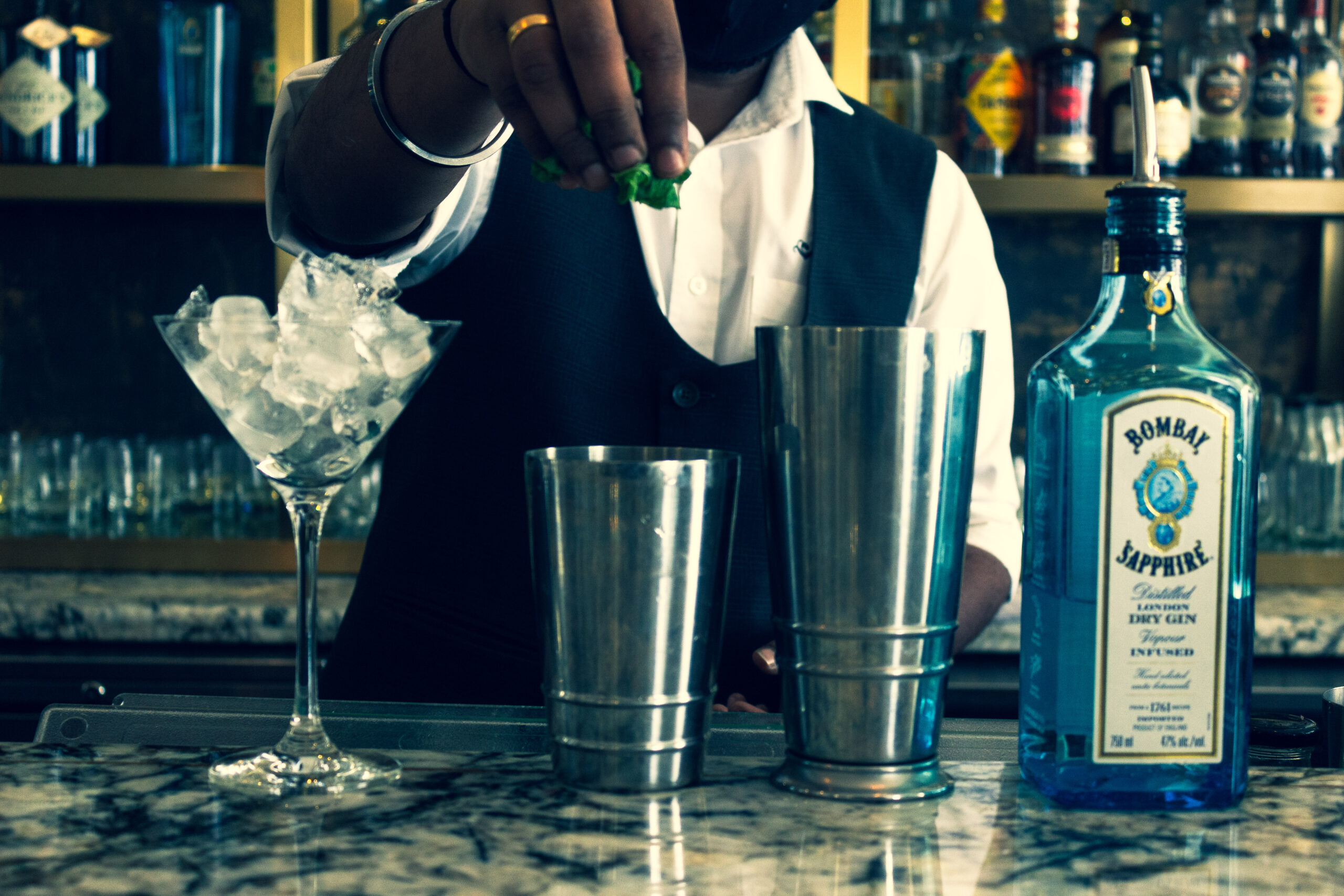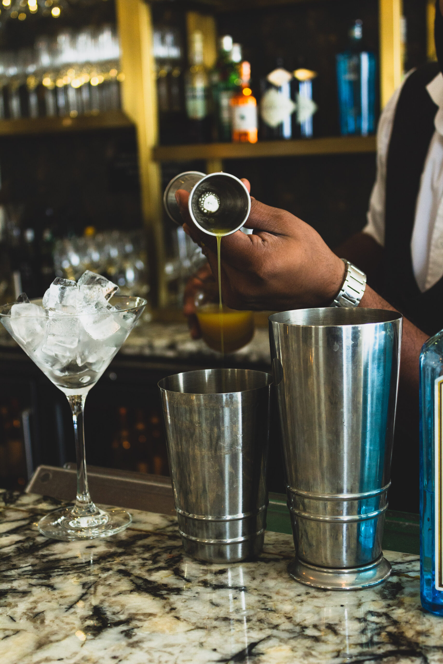A shot captured during the drink mixing process of a bartender.
